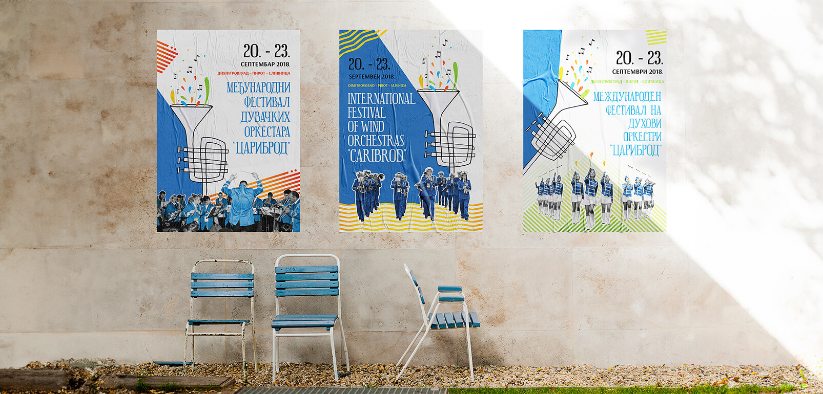 Na jednom od plakata centralni motiv je ilustrovana truba iz koje, poput izvora, izbijaju šarene note i kapi boje, kao simboli radosti, slobode i rasipanja zvuka u prostor. Fotografija orkestra u plavim uniformama i dirigenta okrenutog leđima ka publici donosi autentičnost i toplinu, a ujedno sugeriše da je muzika nešto što se deli, između izvođača i publike, između gradova i zemalja.