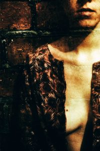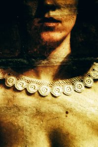 Lice je namerno izostavljeno ili odsečeno iz kadra, nema direktnog pogleda, nema jasnog identiteta. Ono što ostaje su detalji: ruke, vrat, čipka, tekstura tkanine, opeka iza. Fragmenti koji govore više od celine. Telo ovde nije izloženo ono je svedok. Topla, gotovo sepiasta paleta daje fotografijama osećaj starih uspomena, nečega što je već prošlo ali još uvek ostaje pod kožom.